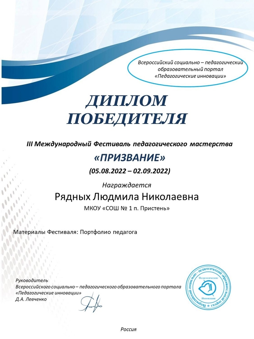 *Диплом Победителя в III Международном фестивале педагогического мастерства "ПРИЗВАНИЕ" 2022