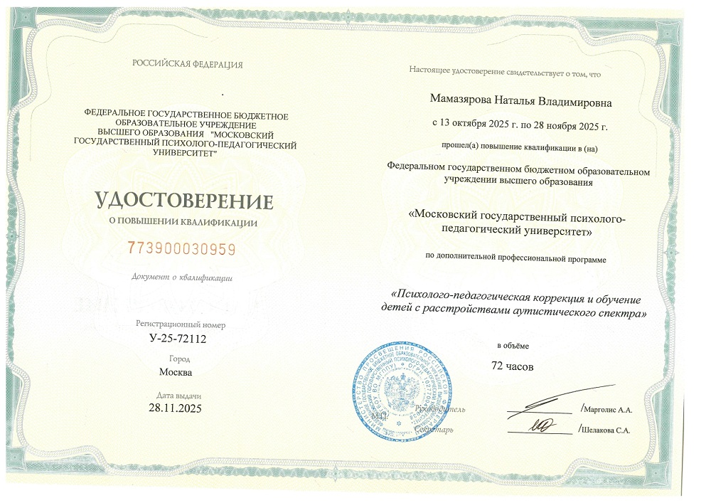 Курсы повышения квалификации «Психолого-педагогическая коррекция и обучение детей с расстройствами аутистического спектра», 72 ч., с 13.10.2025 г. по 28.11.2025 г., г. Москва, ВГБОУ "Московский государственный психолого-педагогический университет"
