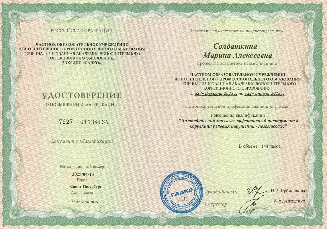 2025 г. ЧОУ ДПО Садко "Логопедический массаж: эффективный инструмент в коррекции речевых нарушений - логомассаж", 144 ч., г. Санкт-Петербург