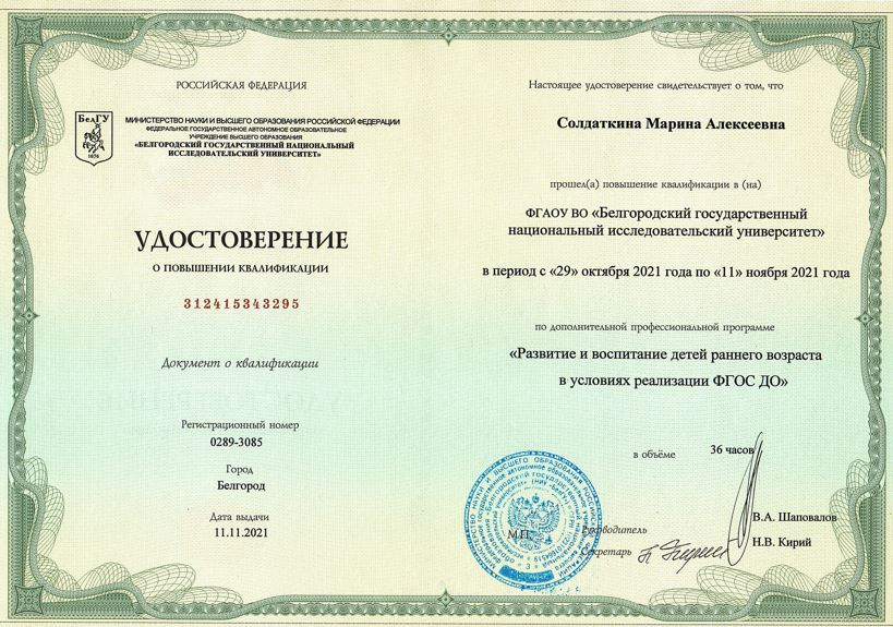 Повышение квалификации по программе: "Развитие и воспитание детей раннего возраста в условиях реализации ФГОС ДО, 72 ч., 29 окт. - 11 янв. 2021 г. Белгород