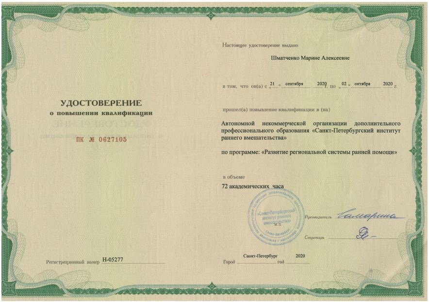 Повышение квалификации по программе: "Развитие региональной системы ранней помощи", 72 ч., 21 сент. - 02 окт. 2020 г. Санкт-Петербург