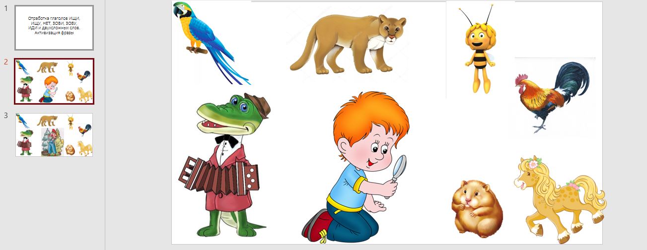Материалы для отработки глаголов ИЩИ, ИЩУ, НЕТ, ЗОВИ, ЗОВУ, ИДИ и двухсложных слов, активизации фразы (Персонажи)