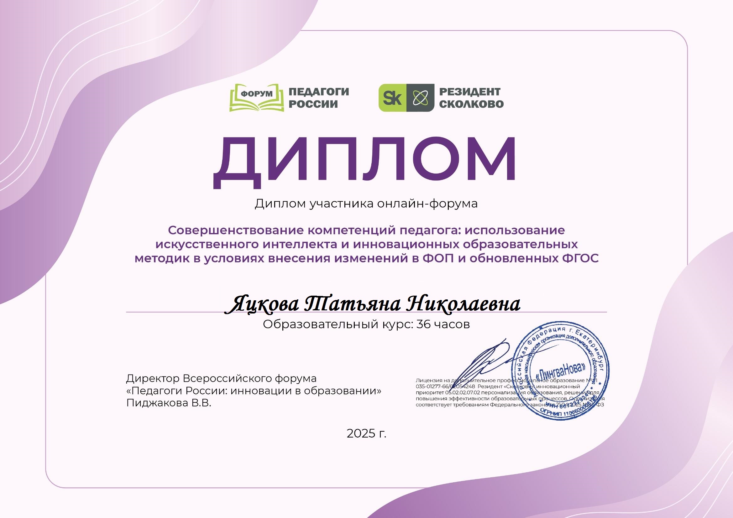 2025 г. "Совершенствование компетенций педагога: использование искуственного интеллекта и инновационных образовательных методик в условиях внесения изменений в ФОП и обновленных ФГОС", 36 ч.