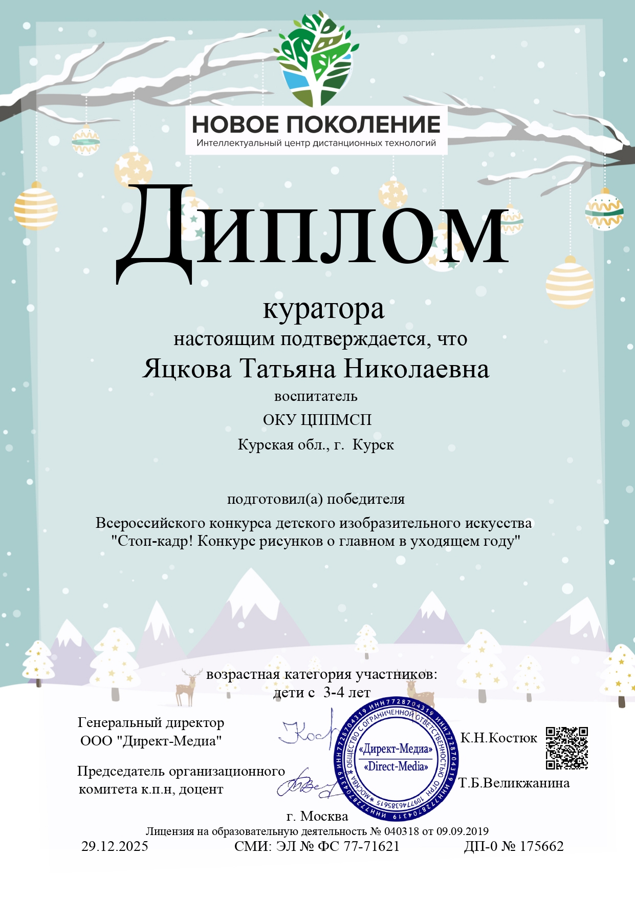 2025 г. Почётная граммота министерство образования и науки Курской области