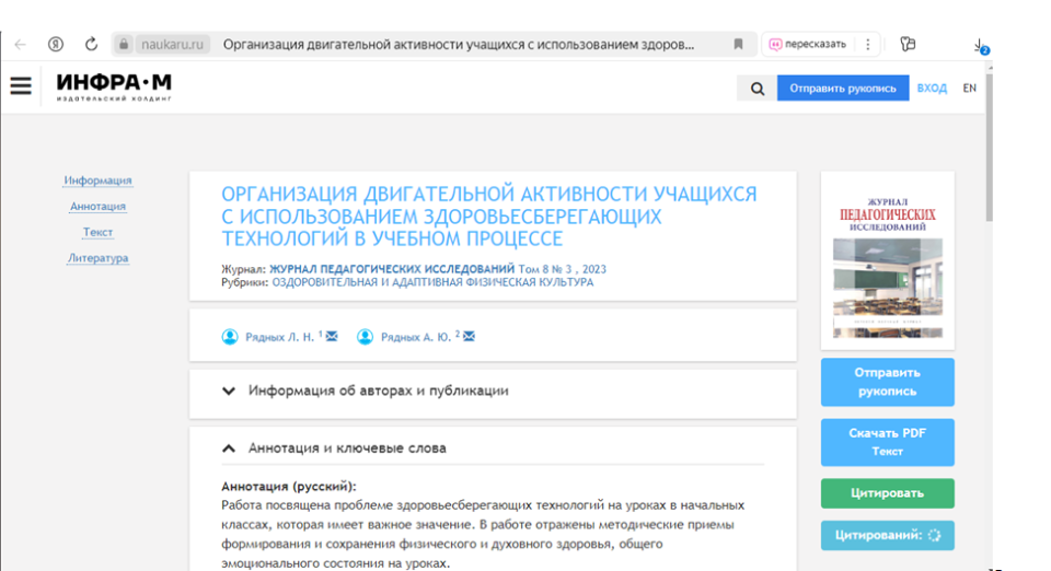 2. 2023г., журнал: «Журнал педагогических исследований» Том 8 № 3, 2023г., рубрики: «Теория и методика обучения и воспитания» по теме: «Организация двигательной активности учащихся с использованием здоровьесберегающих технологий в учебном процессе». https://naukaru.ru/ru/na uka/article/56931/view