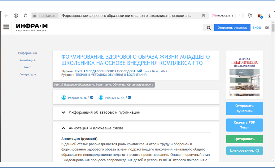 1. 2022г.,журнал:«Журнал педагогических исследований» Том 7 № 4, 2022г., рубрики «Теория и методика Обучения и воспитания» по теме: «Формирование здорового образа жизни младшего школьника на основе внедрения комплекса ГТО» https://naukaru.ru/ru/na uka/article/52709/view
