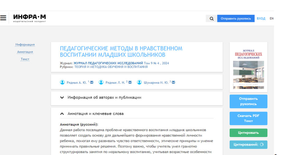 3. 2024г., журнал: «Журнал педагогических исследований» том 9 № 4, 2024г., рубрики: «Теория и методика обучения и воспитания» по теме: «Педагогические методы в нравственном воспитании младших школьников» https://naukaru.ru/ru/nau ka/article/77643/view