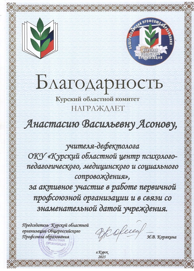 Благодарность от Курской областной организации Общероссийского Профсоюза образования