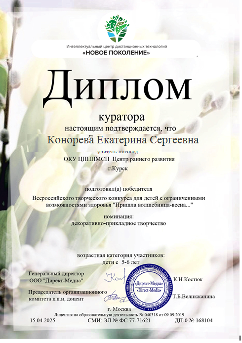 V Всероссийский конкурс профессионального мастерства «Педагогический дебют учителя-дефектолога», Диплом 1 место