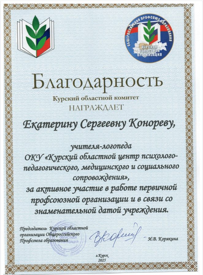 2025г., Благодарность от Курской областной организации Общероссийского Профсоюза образования