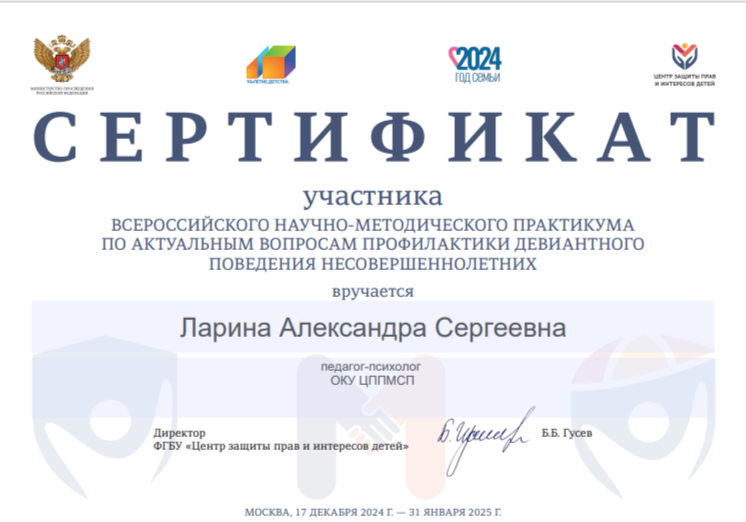 Январь 2025 г. ФГБУ "Центр защиты прав и интересов детей" Всероссийский научно-методический практикум по актуальным вопросам профилактики девиантного поведения рнесовершеннолетних.