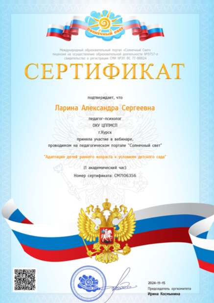 Ноябрь 2024 г. Международный образовательный портал "Солнечный Свет", вебинар "Адаптация детей раннего возраста к условиям детского сада".