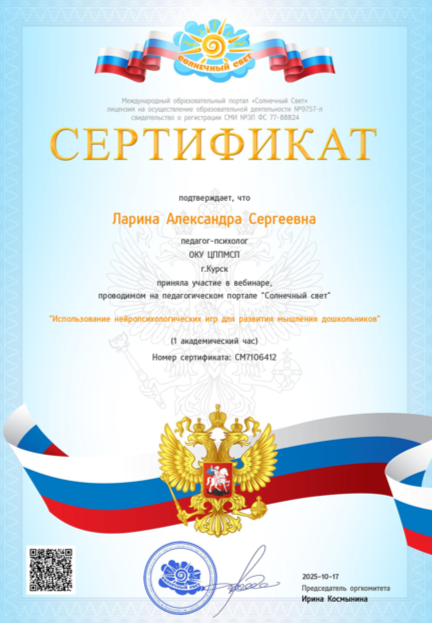 Октябрь 2025 г. Международный образовательный портал "Солнечный Свет", вебинар "Использование нейропсихологических игр для развития мышления дошкольников"