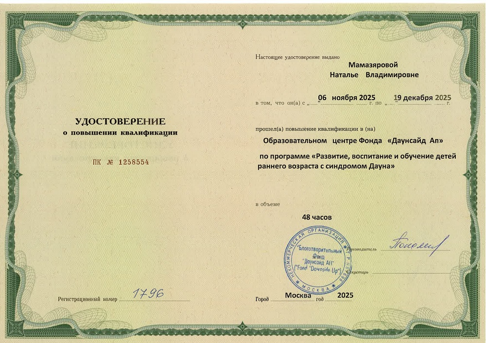 Курсы повышения квалификации «Развитие, воспитание и обучение детей раннего возраста с синдромом Дауна», 42 ч., с 27.09.2022 г. по 08.11.2022 г., Образовательный центр Фонда «Даунсайд Ап», г. Москва