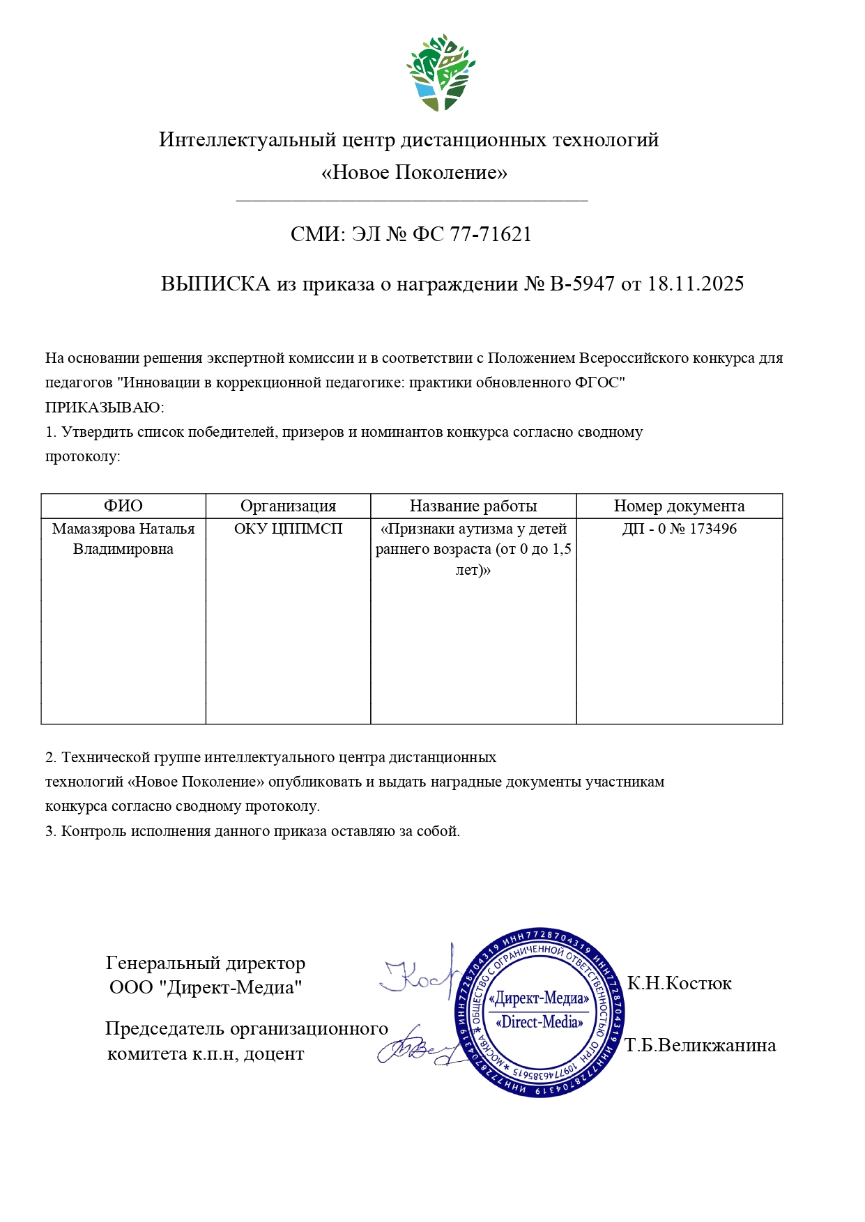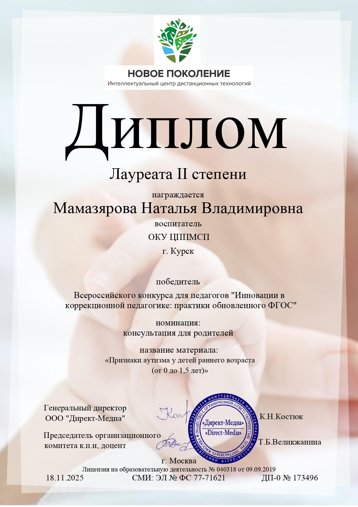 Всероссийский конкурс для педагогов "Инновации в коррекционной педагогике: практики обновлённого ФГОС" в номинации"Консультация для родителей" с материалом на тему: "признаки аутизма у детей раннего возраста (от 0 до 1,5 лет)"