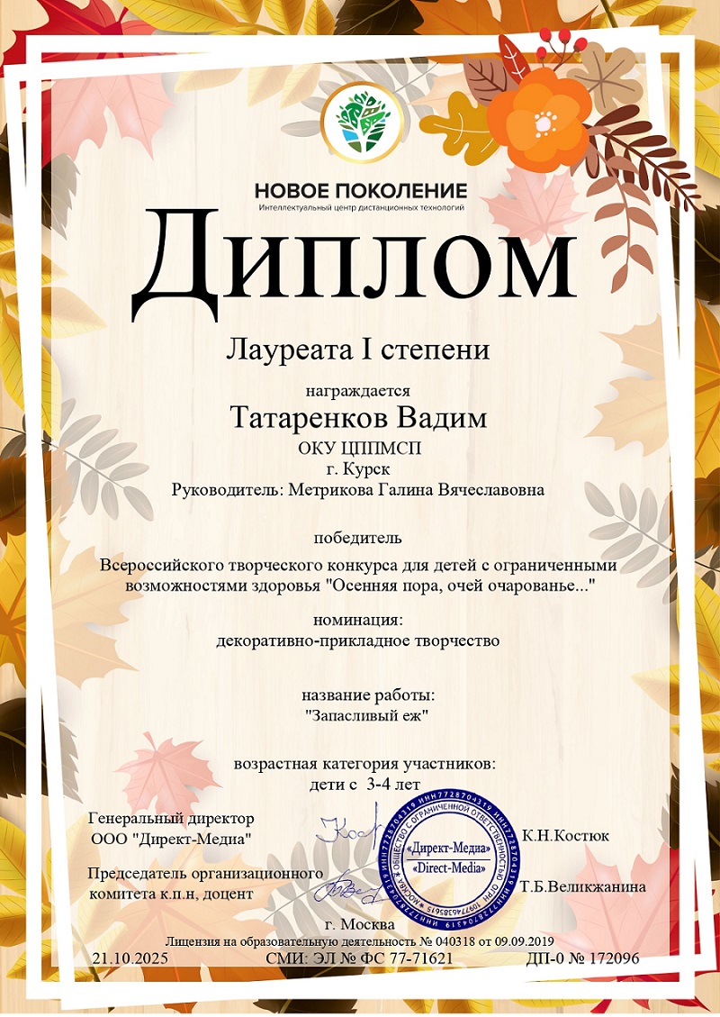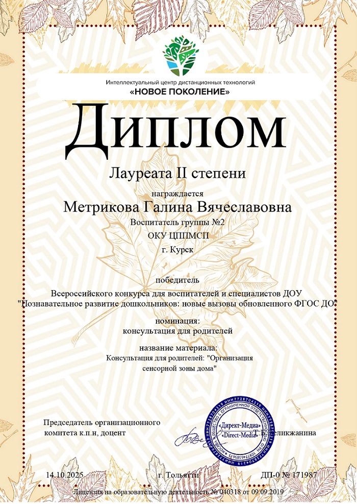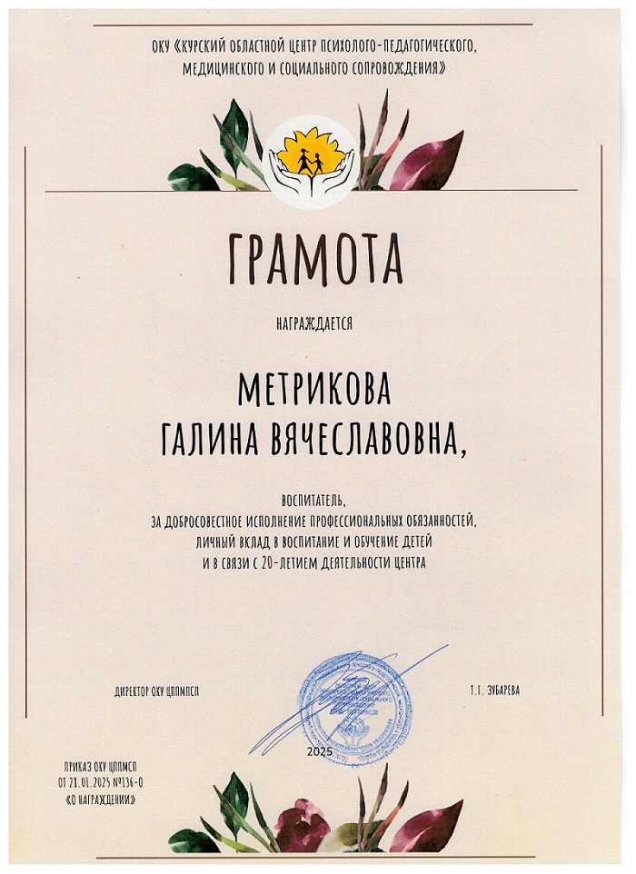 2025г.,"Грамота за добросовестное исполнение профессиональных обязанностей, личный вклад в воспитание и обучение детей и в связи с 20-летием деятельности центра", ОКУ "КУРСКИЙ ОБЛАСТНОЙ ЦЕНТР ПСИХОЛОГО- ПЕДАГОГИЧЕСКОГО, МЕДИЦИНСКОГО И СОЦИАЛЬНОГО СОПРОВОЖДЕНИЯ", г. Курск