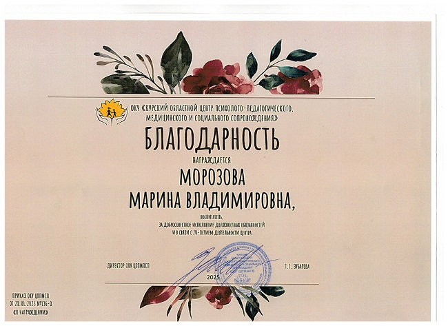 2025 г., Благодарность ОКУ ЦППМСП за добросовестное исполнение должностных обязанностей и в связи с 20-летием деятельности центра. Приказ ОКУ ЦППМСП от 28.01.2025 №136-О "О НАГРАЖДЕНИИ"