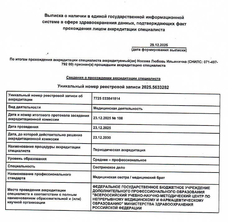 Сведения о наличии допуска к медицинской деятельности по специальности 35 30.12.2025 Категория: Носова Любовь Ильинична