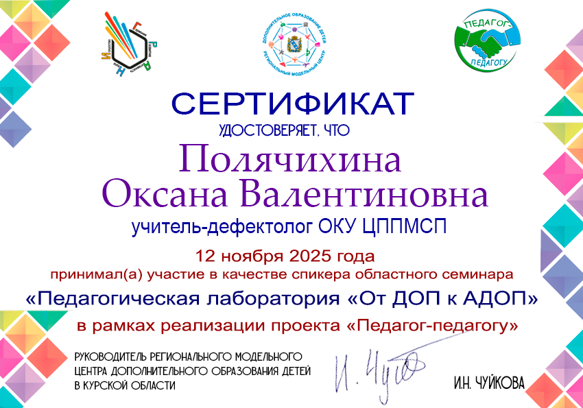 7. 07.12.21г., 09.12.21г. Чтение лекций «Разработка АООП НОО и проектирование идивидуального учебного плана для обучающихся с ОВЗ» в рамках проведения курсов повышения квалификации для учителей начальных классов образовательных организаций Курской области, КИРО.