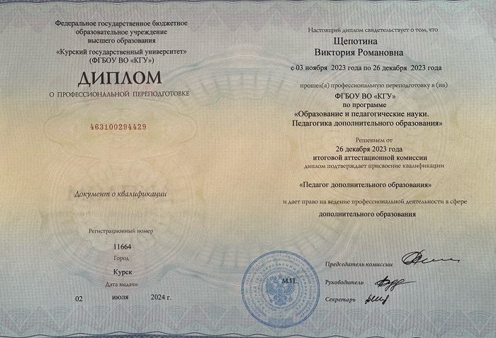 Профессиональная переподготовка. КГУ. Июль 2024 г. "Педагог дополнительного образования"
