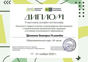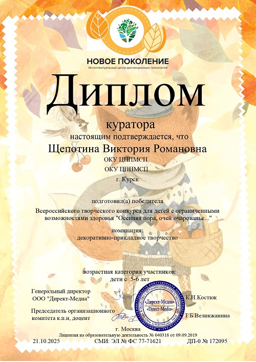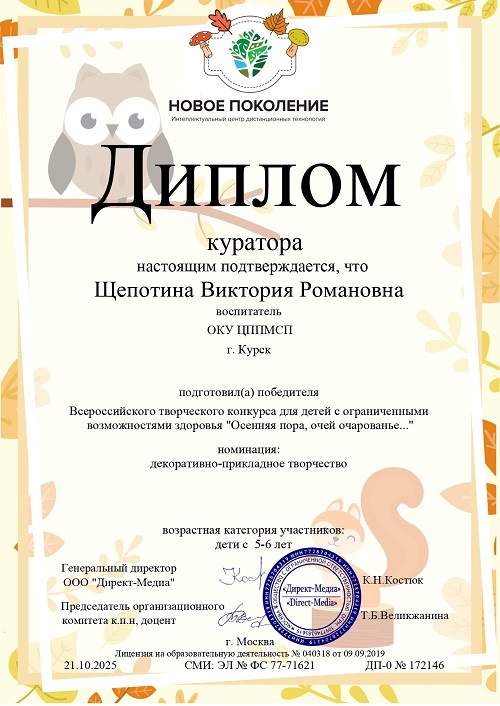 Сведения о награждениях, дипломах 227 19.05.2025 Всероссийсий творческий конкурс для детей с ОВЗ "Осенняя пора, очей очарованье..." 2024-2025 учебный год