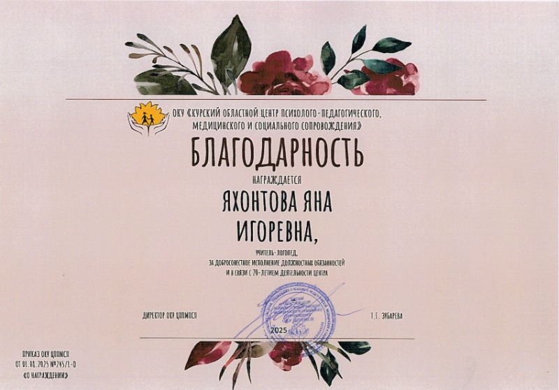 Сведения о награждениях, дипломах 107 10.10.2025 2025 г., Благодарность от ОКУ ЦППМСП за добросовестное исполнение должностных обязаностей и в связи с 20 - летием деятельности центра.