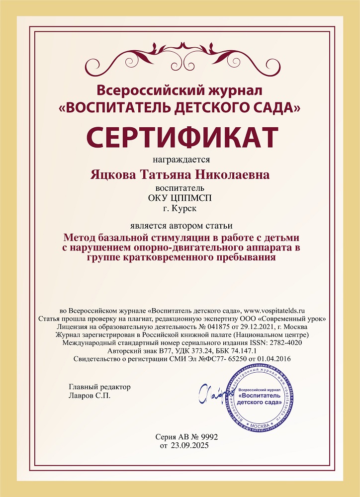 2025 г. Публикация статьи "Метод базальной стимуляции в работе с детьми с нарушением опорно-двигательного аппарата в группе кратковременного пребывания"