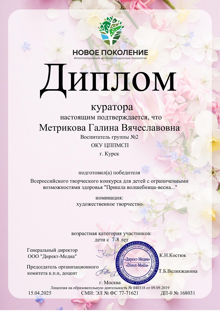 2025г.,"Грамота за добросовестное исполнение профессиональных обязанностей, личный вклад в воспитание и обучение детей и в связи с 20-летием деятельности центра", ОКУ "КУРСКИЙ ОБЛАСТНОЙ ЦЕНТР ПСИХОЛОГО- ПЕДАГОГИЧЕСКОГО, МЕДИЦИНСКОГО И СОЦИАЛЬНОГО СОПРОВОЖДЕНИЯ", г. Курск