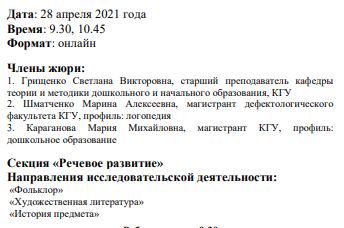 Участие в Детской исследовательской конференции «Мир на ладошке» среди дошкольных образовательных организаций города Курска, Секция «Речевое развитие» в качестве члена жури.